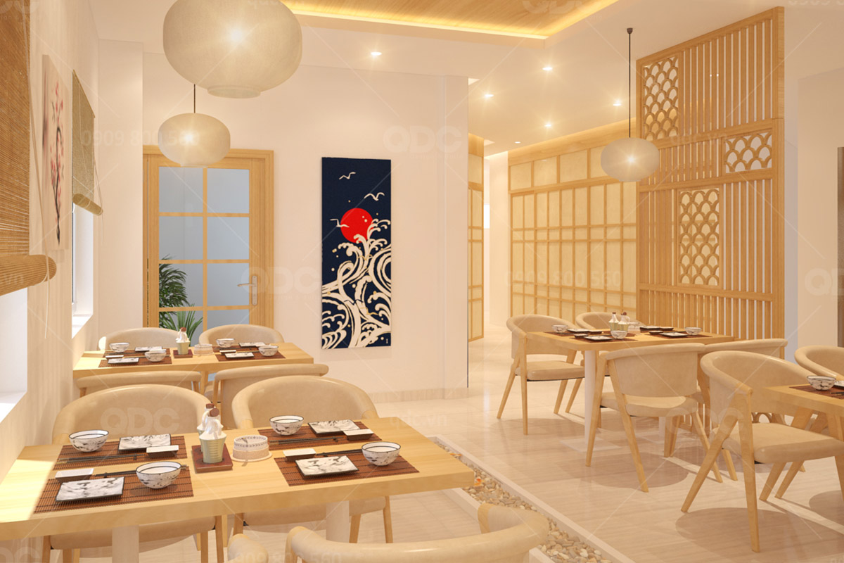 Đặc điểm nổi bật: Với phong cách nhà hàng Nhật Bản được thiết kế tối giản ưu tiên sự tiện dụng. Từ màu sắc đến trang trí nội ngoại thất của phòng ăn, cửa sổ hoặc cửa ra vào đều được tính toán hợp lý để thiết kế một không gian rộng rãi và tự nhiên nhất.